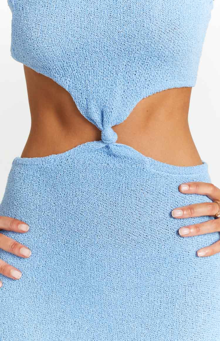 - Say hello to luxe in this ultra-flattering blue midi dress! The details of this dress are to die for. The cutouts, high slit, open back, and strapless design - what's not to love! Pair with strappy heels and a necklace for your next dinner date!