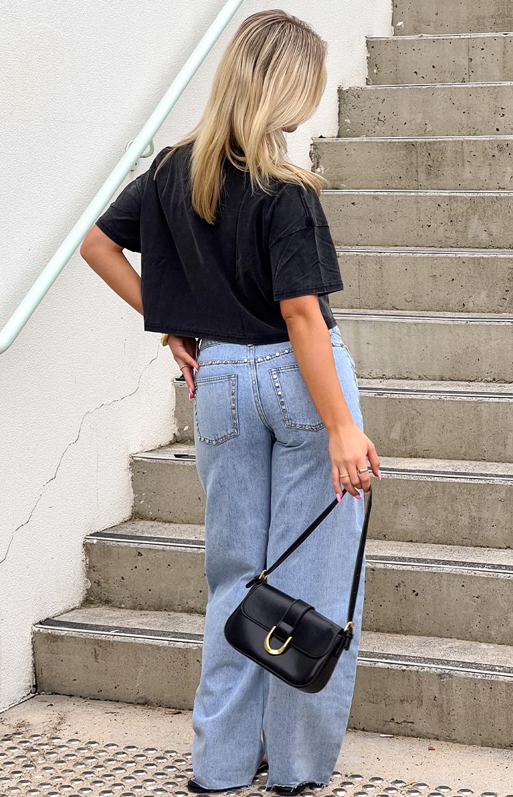 Elevate your denim collection with our Jannina Light Wash Jeans, the on-trend staple for effortlessly cool everyday style! Featuring a relaxed barrel leg and a raw hem, these low-rise jeans are finished with edgy stud detailing around the front and back pockets. Style them with a baby tee and sneakers for a perfect model-off-duty look.